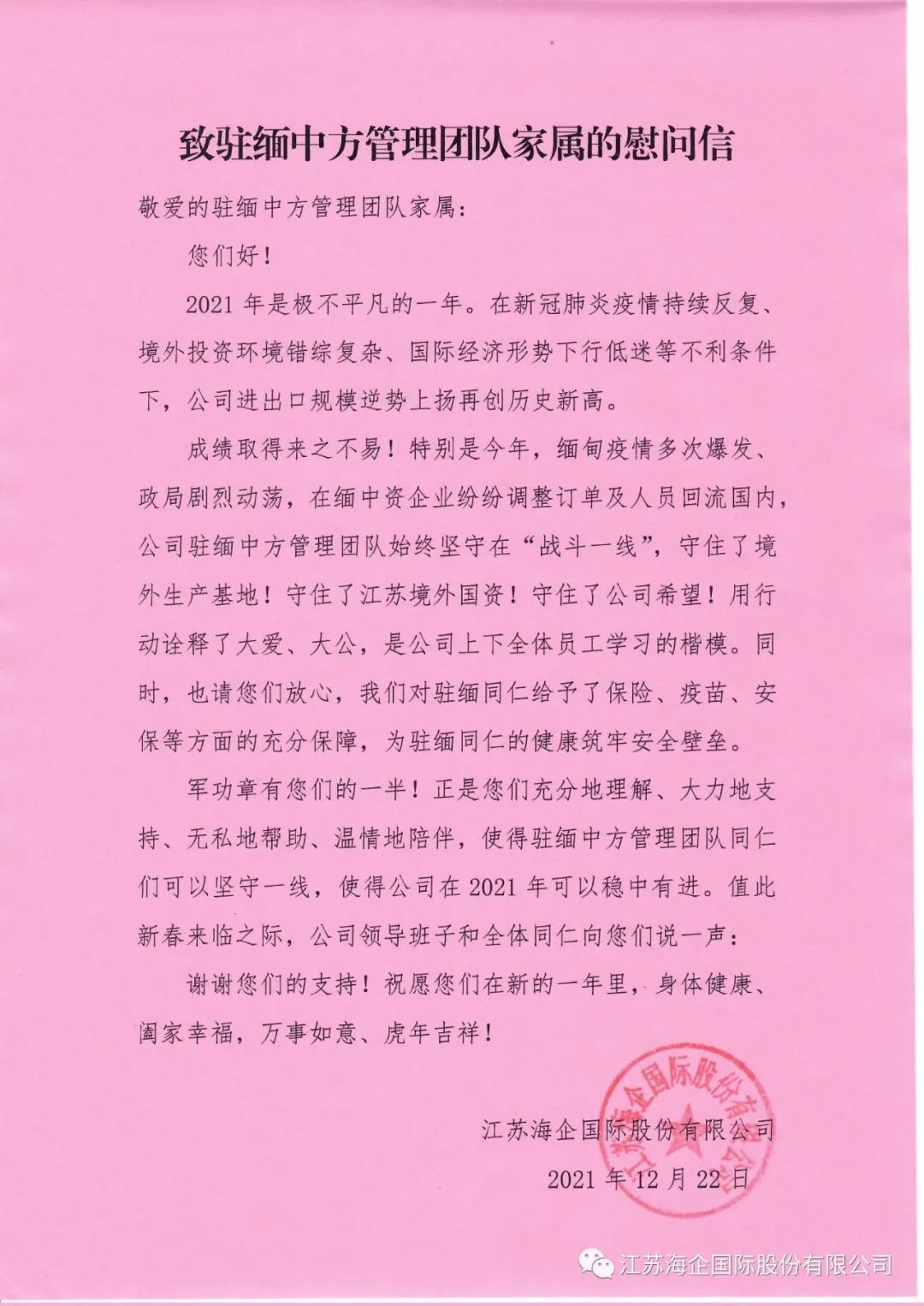 由于近期國內(nèi)頻發(fā)零散疫情,國際公司先后多次調(diào)整慰問方案,精心準備慰問信與慰問品,直接送到或者郵寄到每位海外員工的家中,做到全覆蓋。在慰問信中,國際公司表達了對駐緬員工及家屬親切的慰問和良好的祝愿。國際公司表示,2021年,緬甸疫情多次爆發(fā)、政局劇烈動蕩,駐緬中方管理團隊始終堅守在“戰(zhàn)斗一線”,守住了境外生產(chǎn)基地!守住了江蘇境外國資!守住了公司希望!用行動詮釋了大愛、大公,是公司上下全體員工學習的楷模。