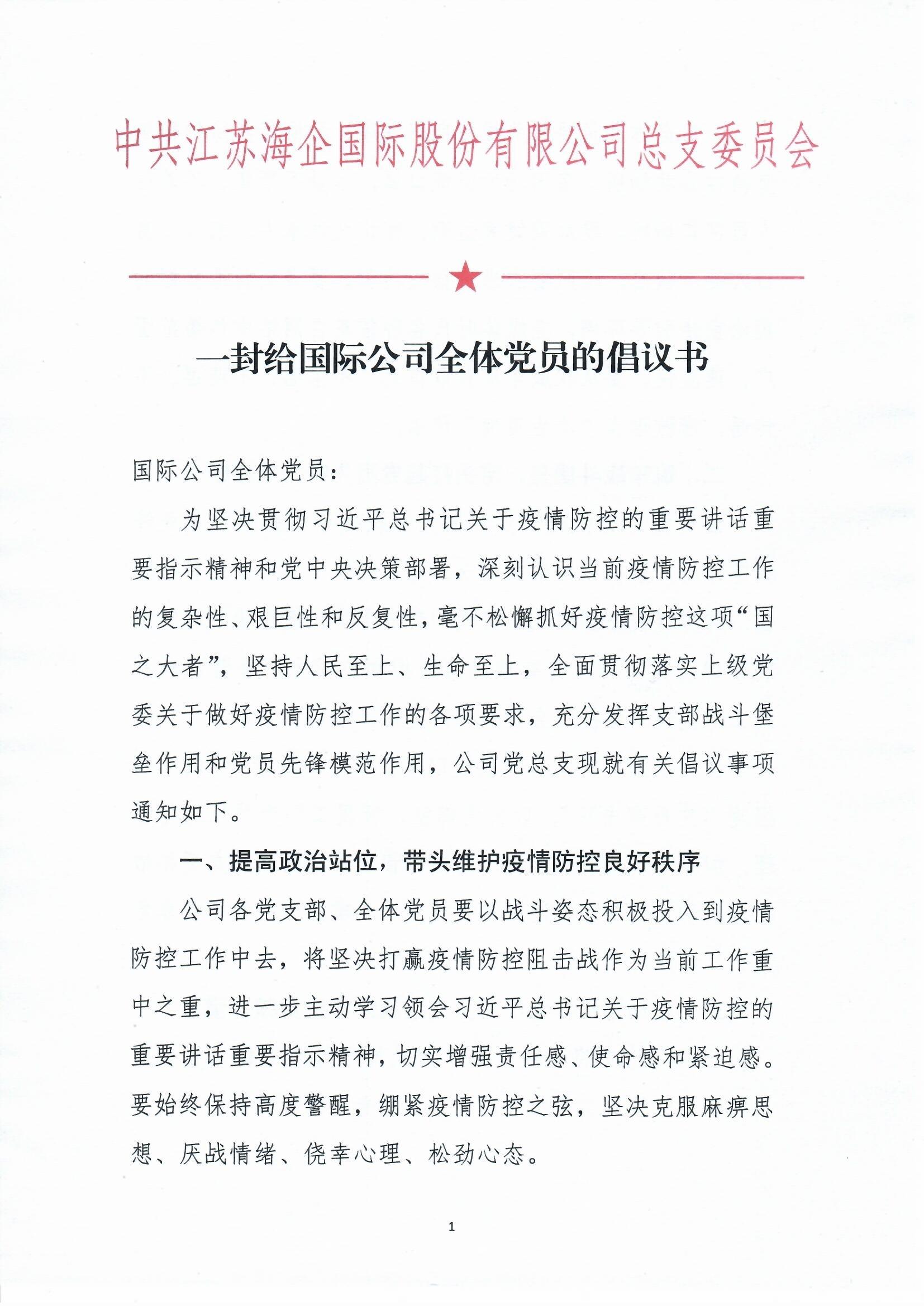 為堅(jiān)決貫徹習(xí)近平總書(shū)記關(guān)于疫情防控的重要講話重要指示精神和黨中央決策部署,深刻認(rèn)識(shí)當(dāng)前疫情防控工作的復(fù)雜性、艱巨性和反復(fù)性,毫不松懈抓好疫情防控這項(xiàng)“國(guó)之大者”,堅(jiān)持人民至上、生命至上,全面貫徹落實(shí)上級(jí)黨委關(guān)于做好疫情防控工作的各項(xiàng)要求,充分發(fā)揮支部戰(zhàn)斗堡壘作用和黨員先鋒模范作用,公司黨總支現(xiàn)就有關(guān)倡議事項(xiàng)通知如下。