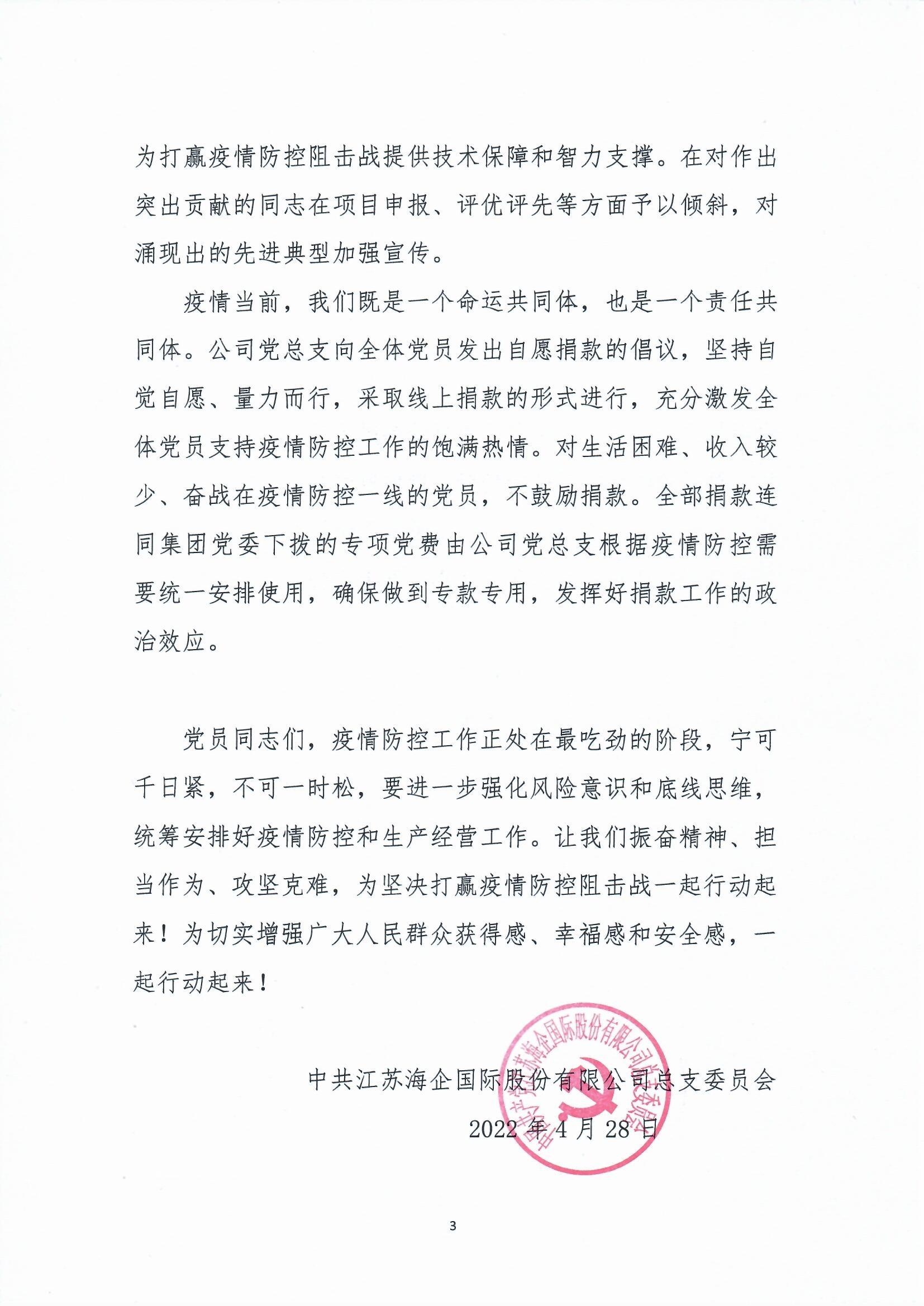 疫情當(dāng)前,我們既是一個(gè)命運(yùn)共同體,也是一個(gè)責(zé)任共同體。公司黨總支向全體黨員發(fā)出自愿捐款的倡議,堅(jiān)持自覺(jué)自愿、量力而行,采取線上捐款的形式進(jìn)行,充分激發(fā)全體黨員支持疫情防控工作的飽滿熱情。對(duì)生活困難、收入較少、奮戰(zhàn)在疫情防控一線的黨員,不鼓勵(lì)捐款。全部捐款連同集團(tuán)黨委下?lián)艿膶m?xiàng)黨費(fèi)由公司黨總支根據(jù)疫情防控需要統(tǒng)一安排使用,確保做到專款專用,發(fā)揮好捐款工作的政治效應(yīng)。